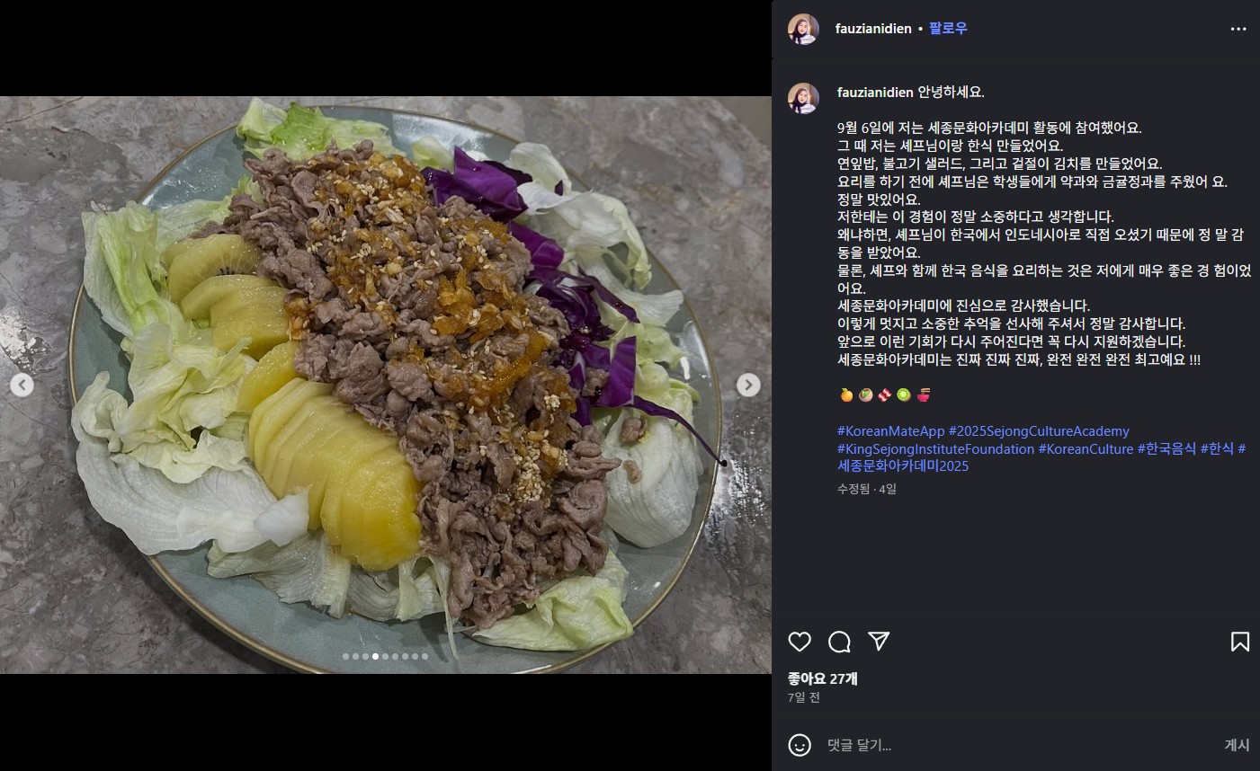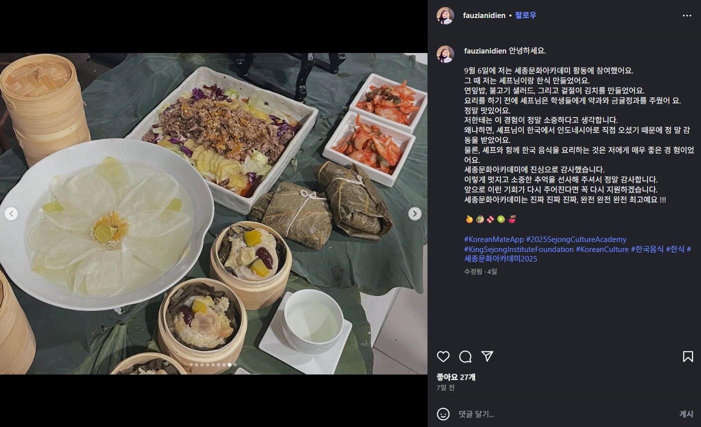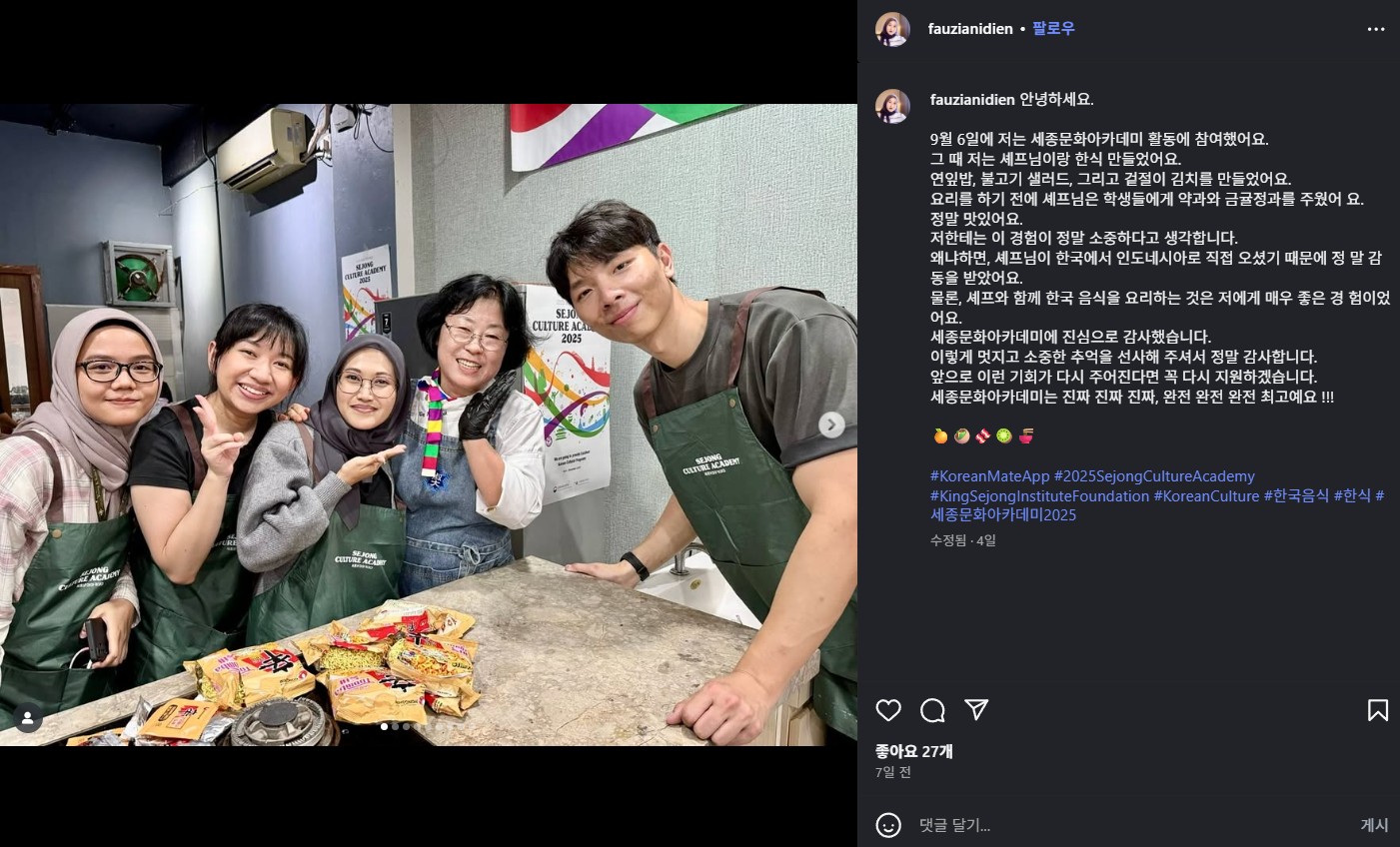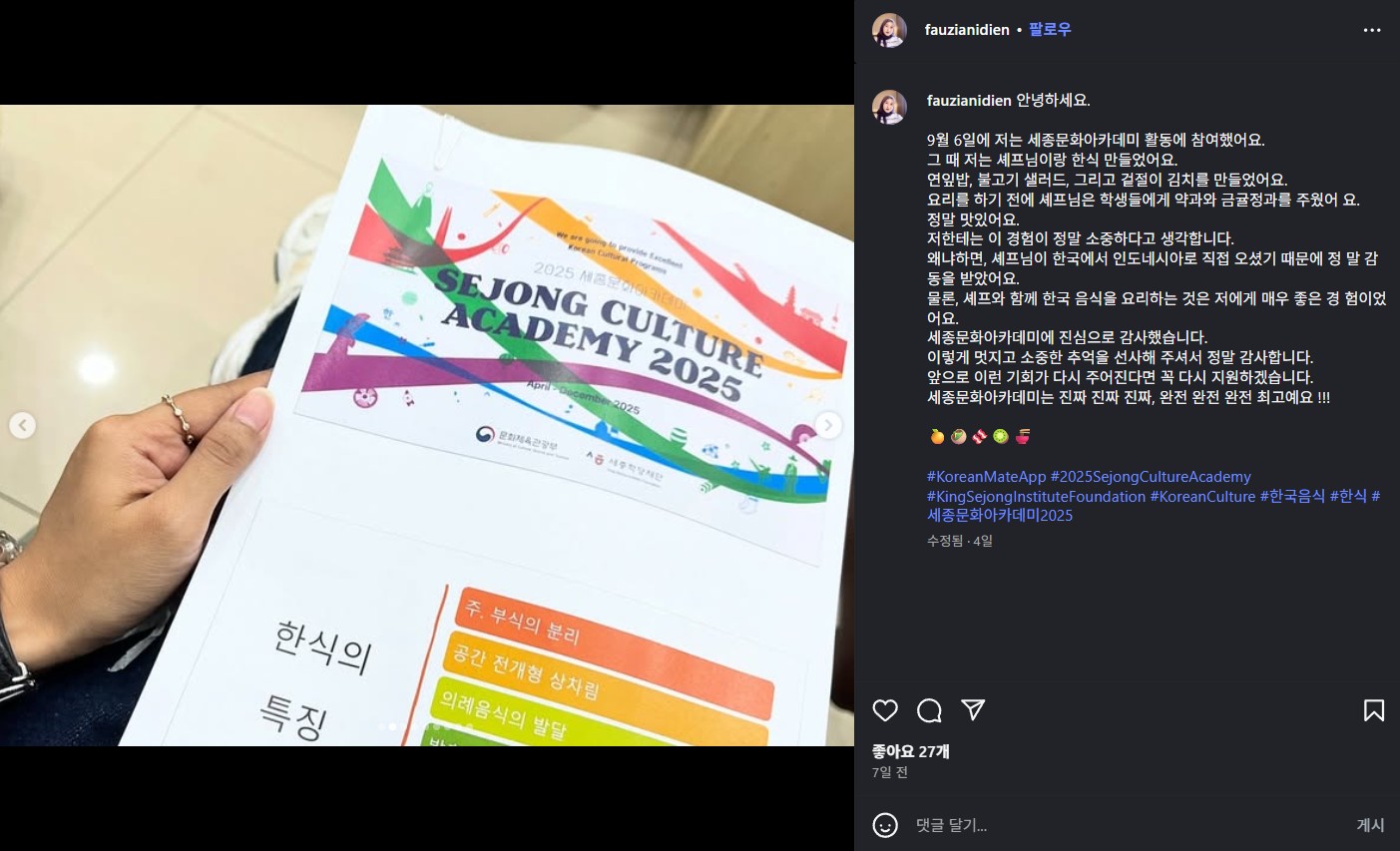 인도네시아 자카르타 세종학당 일정2025.09.06 ~ 2025.09.07 instagram : @Fauzianidien https://www.instagram.com/p/DOSyKndEo9U/?igsh=ZzRta3c0cDVxZGJh 댓글 0댓글쓰기 댓글목록 등록된 댓글이 없습니다. 이전글 주독일한국문화원 세종학당 다음글 오시2 세종학당 목록
