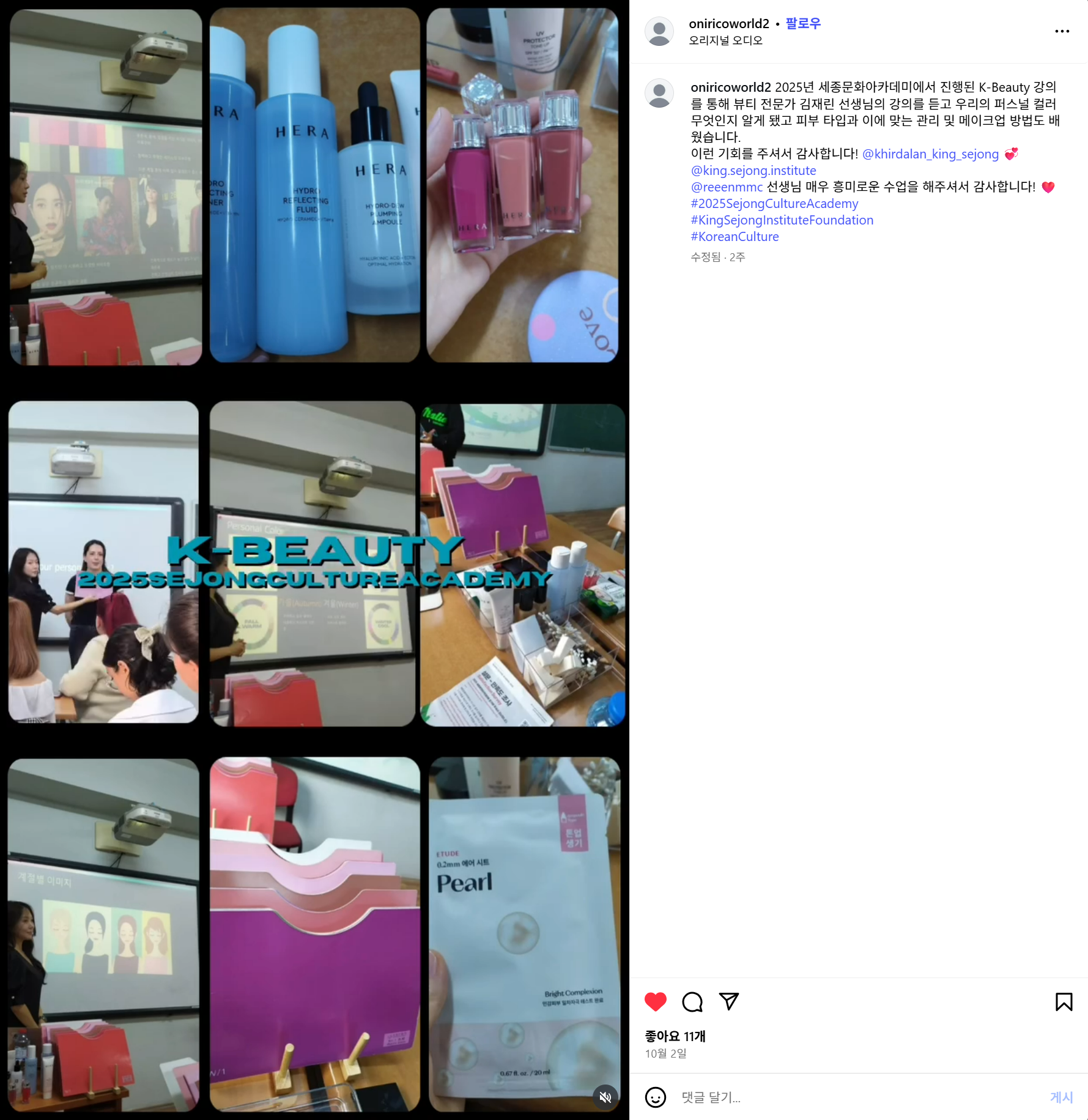 아제르바이잔 흐르달란 세종학당 일정2025.09.25.~2025.09.27. 인스타그램 : @oniricoworld2 https://www.instagram.com/reel/DPT2FbujJ9b/?utm_source=ig_web_copy_lin… 댓글 0댓글쓰기 댓글목록 등록된 댓글이 없습니다. 이전글 프랑스 거점 세종학당 다음글 주스리랑카대사관 목록
