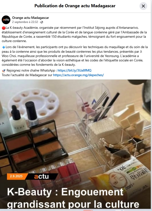 [안타나나리보 세종학당] 세종문화아카데미 K-뷰티 강좌 개최 등록일2025.09.25 조회수35 댓글 0댓글쓰기 댓글목록 등록된 댓글이 없습니다. 이전글 이전 글이 없습니다. 다음글 [지자흐 세종학당] 세종문화아카데미 K-뷰티 강좌 개최 목록