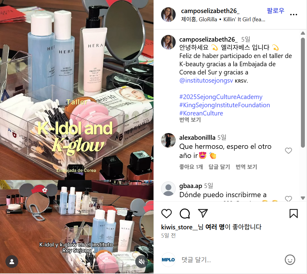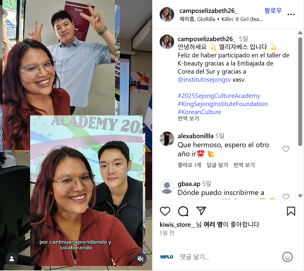 엘살바도르 주엘살바도르대한민국대사관 일정2025.10.09.~2025.10.11. 인스타그램 : @camposelizabeth26_ https://www.instagram.com/reel/DP-A4d8jCum/?utm_source=ig_web_copy_lin… 댓글 0댓글쓰기 댓글목록 등록된 댓글이 없습니다. 이전글 지자흐 세종학당 다음글 프랑스 거점 세종학당 목록